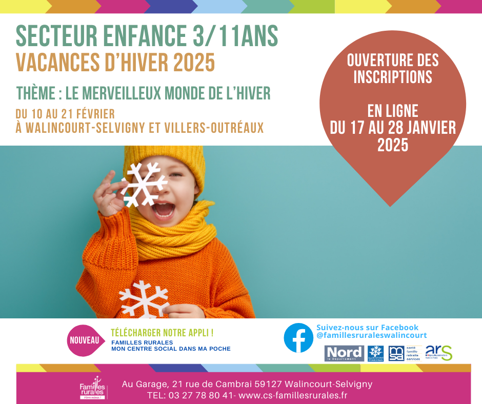 Les inscriptions à l’Accueil de Loisirs pour les enfants de 3 à 11 ans (10 au 21 février 2025) sont ouvertes...